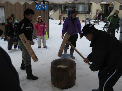 Which brings me to how it's made. This is done with two people (or two usagi, if you're on the moon) with large wooden hammers repeatedly hitting this blob until it turns all sticky and gooey and awesome.
